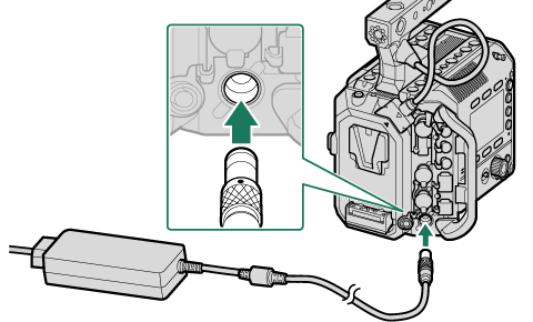 Instead of the AC power adapter, you can also use a V-mount battery to charge the supplied battery (aV-mount Batteries).