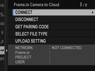 Select [Frame.io Camera to Cloud] > [CONNECT] in the network/USB settings menu.