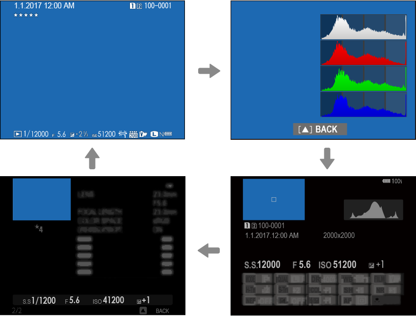In the info display, you can press the selector up to cycle through a series of information and histogram displays.