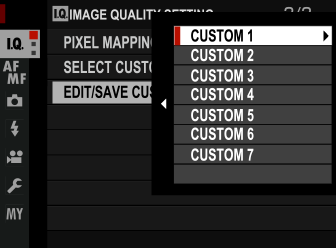 Save up to 7 sets of custom camera settings for commonly-encountered situations. Saved settings can be recalled using [IMAGE QUALITY SETTING] > [SELECT CUSTOM SETTING].