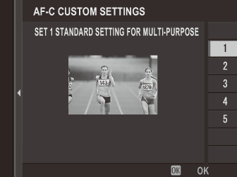 Select focus-tracking options for focus mode [C]. Choose from Sets 1–5 according to your subject.
