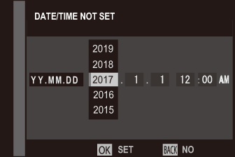 Press the selector left or right to highlight the year, month, day, hour, or minute and press up or down to change. To change the order in which the year, month, and day are displayed, highlight the date format and press the selector up or down. Press [MENU]/[OK] to exit to shooting mode when settings are complete.