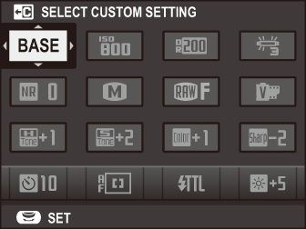 Select [NONE] to assign no option to the selected position. When [SELECT CUSTOM SETTING] is selected, current settings are shown in the quick menu by the label [BASE].