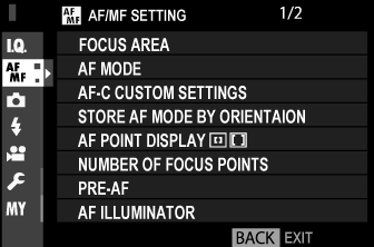 To display focus settings, press [MENU]/[OK] in the shooting display and select the ([AF/MF SETTING]) tab.