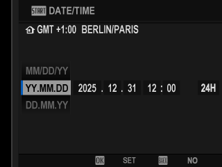 When prompted, choose a time zone and turn daylight savings time on or off using the focus stick (focus lever), then highlight [SET] and press [MENU/OK].