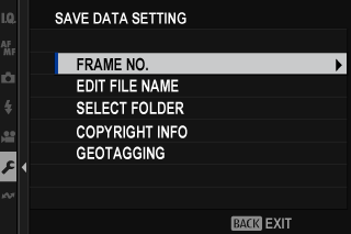To access file management settings, press [MENU/OK], select the D([SET UP]) tab, and choose [SAVE DATA SET-UP].
