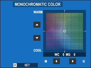 • Press the focus stick left or right to adjust colors on the cyan–red axis.