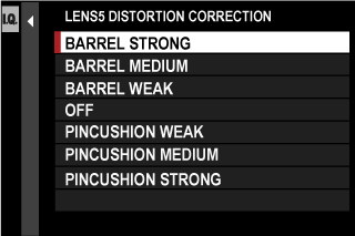 Choose from [STRONG], [MEDIUM], or [WEAK] options to correct [BARREL] or [PINCUSHION] distortion.