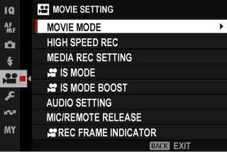 This item is also found in the movie menus (aF[IS MODE] (Movie Recording)). Changes here also apply to the item in the movie menus.