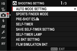 Choose from [AUTO] and [MANUAL] focus bracketing modes (aZ[FOCUS BKT]).
