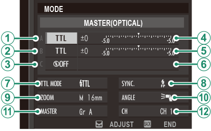 The options will be displayed if the unit is currently functioning as master flash for FUJIFILM optical wireless remote flash control.