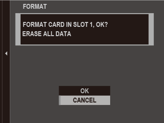 A confirmation dialog will be displayed. To format the memory card, highlight OK and press MENU/OK. To exit without formatting the memory card, select CANCEL or press DISP/BACK.