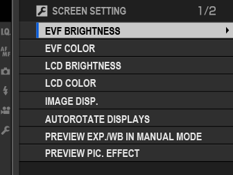 Adjust the brightness of the display in the electronic viewfinder. Select MANUAL to choose from 13 options from +5 (bright) to −7 (dark), or select AUTO for automatic brightness adjustment.
