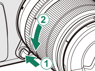 To remove the lens, turn the camera off, then press the lens release button () and rotate the lens as shown ().