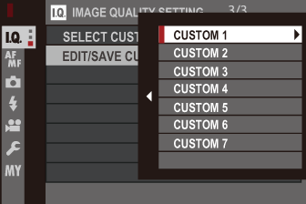 Press MENU/OK in shooting mode to display the shooting menu. Select the IMAGE QUALITY SETTING tab, then highlight EDIT/SAVE CUSTOM SETTING and press MENU/OK.