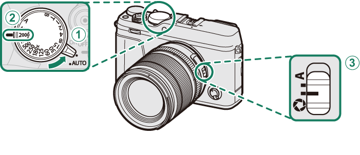 For control over shutter speed and aperture (P, S, A, and M modes), rotate the auto mode selector lever to