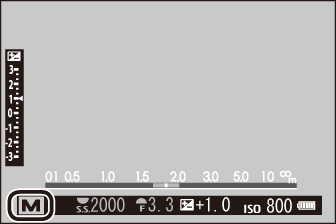 Confirm that M appears in the display. The amount the picture would be under- or over-exposed at current settings is shown by the exposure indicator; adjust shutter speed and aperture until the desired exposure is reached.