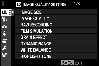 Press MENU/OK in the shooting display and select the IMAGE QUALITY SETTING tab.