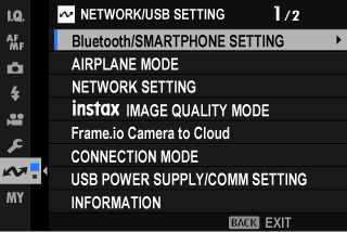 To access network/USB settings from the shooting or playback display, press MENU/OK and select the I (network/USB setting) tab.