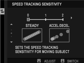 | SET 3 FOR ACCELERATING/DECELERATING SUBJECT | The focus system attempts to compensate for subject acceleration or deceleration. Choose for subjects prone to rapid changes in velocity. |