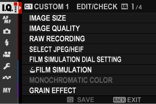 Assign a film simulation to FS1, FS2, and FS3 on the film simulation dial or set whether to save the image quality settings.