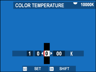 Add a reddish or bluish tinge (warm or cool color cast) to the aACROS and bMONOCHROME monochrome film simulations. Color can be adjusted on the WARM–COOL and G (Green)–M (Magenta) axes.