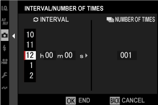 To continue shooting until the number of shots taken equals the number of exposures remaining at the time interval-timer photography started, set the number of shots to ∞.