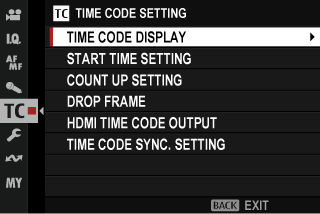 To display time code settings, press MENU/OK in the movie shooting display and select the Q (TIME CODE SETTING) tab.