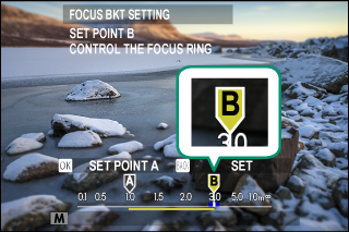 Select ASHOOTING SETTING in the shooting menu, highlight FOCUS BKT SETTING, and press MENU/OK.
