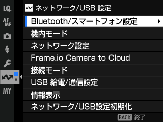 撮影画面または再生画面でMENU/OKボタンを押し、I(ネットワーク/USB設定)タブを選びます。