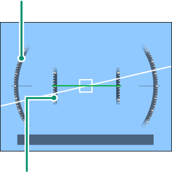 カメラの傾きを感知して表示します。三脚設置時など、カメラを水平にしたいときは、2本の線が重なるよう、カメラの傾きを調整してください。カメラのレンズ面を上下に向けたときは、表示が消えることがあります。電子水準器を割り当てたファンクションボタンを押すと、3D表示になります(ファンクション(Fn)設定、ファンクションボタンの割り当て変更)。