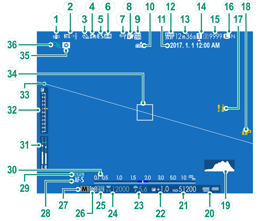 撮影時は、ファインダー(EVF)/ 液晶モニター(LCD)に次の情報が表示されます。