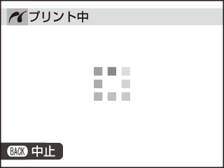 プリント中に DISP/BACK ボタンを押すと、プリントを中止します。プリンターによっては、すぐに中止できないことやプリントの途中で停止することがあります。プリントの途中で動作が止まってしまったときは、カメラの電源をいったんオフにしてから、もう一度電源をオンにしてください。