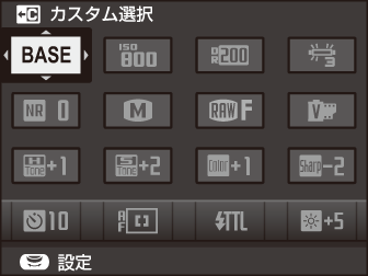 カスタム選択を選ぶと、クイックメニューにはBASEと表示され、現在の設定を表しています。