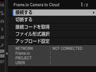 ネットワーク/USB設定メニューのFrame.io Camera to Cloud > 接続するを選びます。