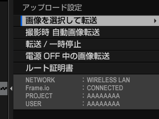Frame.ioへのファイル転送をカメラ側で一時停止しています。接続を再開するには、Frame.io Camera to Cloud > アップロード設定の転送/一時停止を転送にしてください。 |