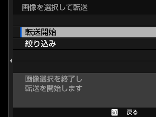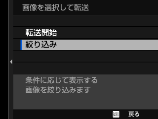 画像選択画面でDISP/BACKボタンを押してから絞り込みを選ぶと、表示するファイルの絞り込みができます。