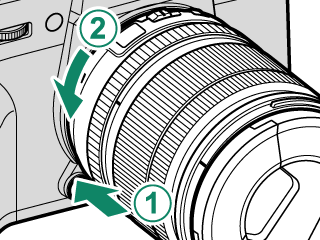 レンズを取り付けるときは、レンズ取り外しボタンを押さないでください。