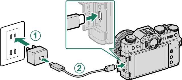 本製品にACアダプターおよびUSBケーブルは付属していません。カメラ本体で充電する場合は、USB-IF認証取得のACアダプター/ USB-C to USB-Cケーブルをご使用ください。