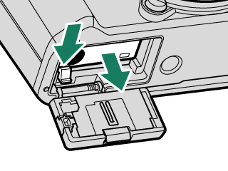 カメラの電源をオフにしてからバッテリーカバーを開け、バッテリー取り外しつまみを指で動かしてロックを外してください。