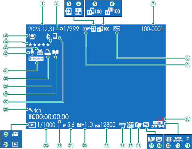 再生時は、画面(EVF/LCD)に次の情報が表示されます。