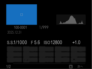 1コマ再生時にフォーカスレバーを上に動かすと撮影時の情報を確認できます。