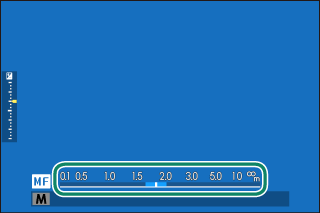 白い線はピントの中心値を、青いバーは被写界深度を示します。距離指標の単位は、D表示設定 > 距離指標の単位でメートルとフィートを切り替えられます。