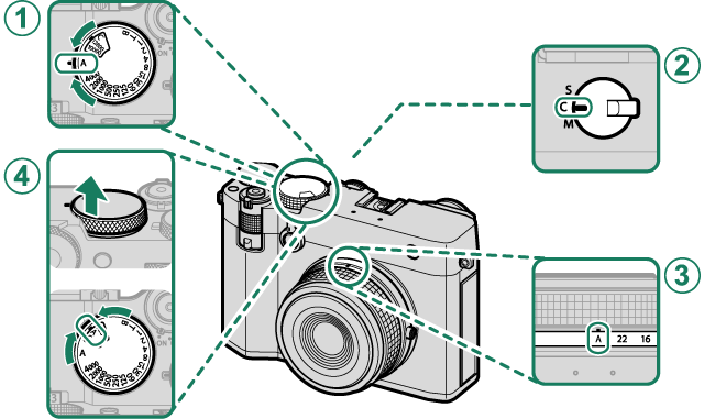 - 使用对焦模式选择器选择对焦模式。无论选择哪个选项,当 GAF/MF 设置 > g脸部识别/眼睛识别设置 或 对象检测设定 选为 脸部识别开 或 对象检测开启 时,相机将自动切换至对焦模式 C(连续自动对焦)。但是请注意,当选择 脸部识别开 或 对象检测开启 时选择对焦模式 M 会禁用脸部和对象检测。