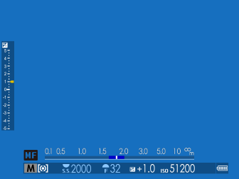 手动对焦指示显示对焦距离与相机至对焦框中拍摄对象之间距离的符合程度。白线表示与对焦区域中拍摄对象间的距离(以米还是英尺为单位取决于设置菜单中 屏幕设置 > 对焦距离指示单位 的所选项);蓝条表示景深,即拍摄对象前后清晰对焦的距离。