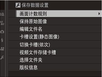 若要访问文件管理设定,请按下 MENU/OK,选择 (设置)选项卡,并选择 保存数据设置。