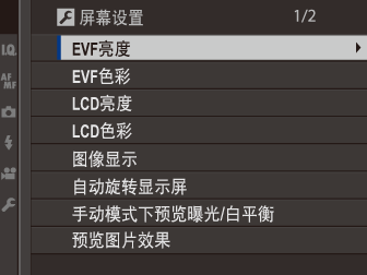 若要访问屏幕设定,请按下 MENU/OK,选择 (设置)选项卡,并选择 屏幕设置。