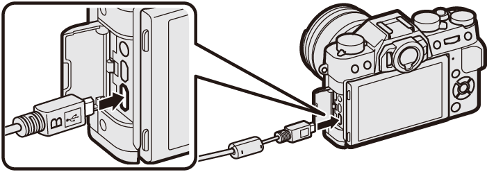 若相机连接至计算机,电池也会充电。请关闭相机,插入电池,并如图所示连接 USB 线,确定接头完全插好。充电时间不受所使用连接线类型的影响,约为 300 分钟。