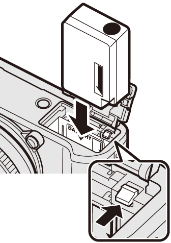 使用电池将电池释放搭扣推至一旁,并按照箭头所示方向将电池端子朝里插入电池。请确认电池已固定到位。