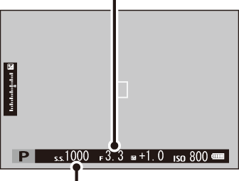 若在所选光圈下无法获得正确的曝光,快门速度将显示为红色。若拍摄对象位于相机测光范围之外,快门速度将显示为“– – –”。